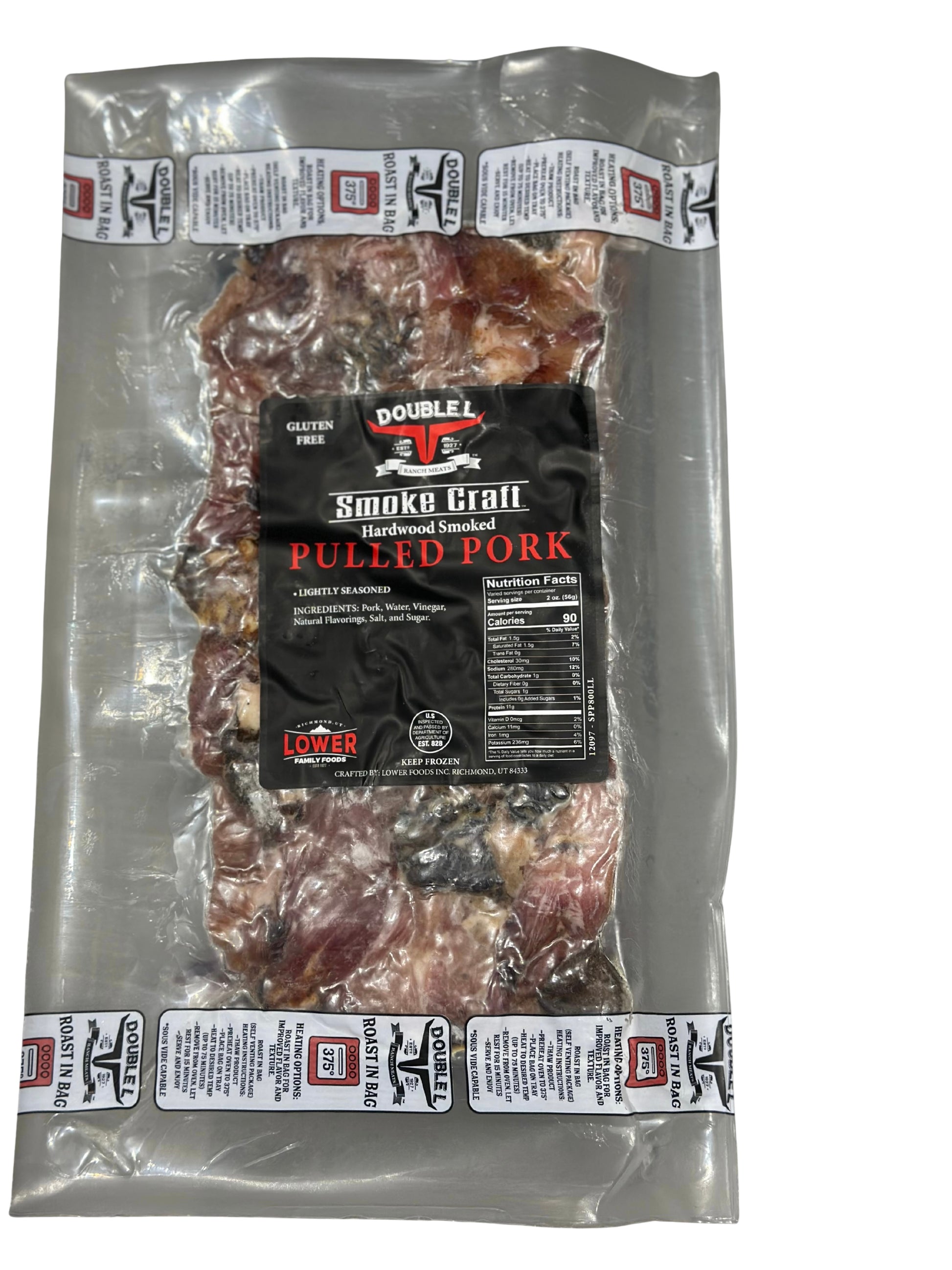 Enjoy tender, smoky perfection with Double L Smoke Craft Hardwood Smoked Pulled Pork. This lightly seasoned pork is slow-smoked over hardwood, hand-pulled for authentic texture, and ready to heat and serve. Crafted with simple ingredients and rich natural flavor, it’s the perfect centerpiece for BBQ sandwiches, tacos, or loaded mac and cheese.