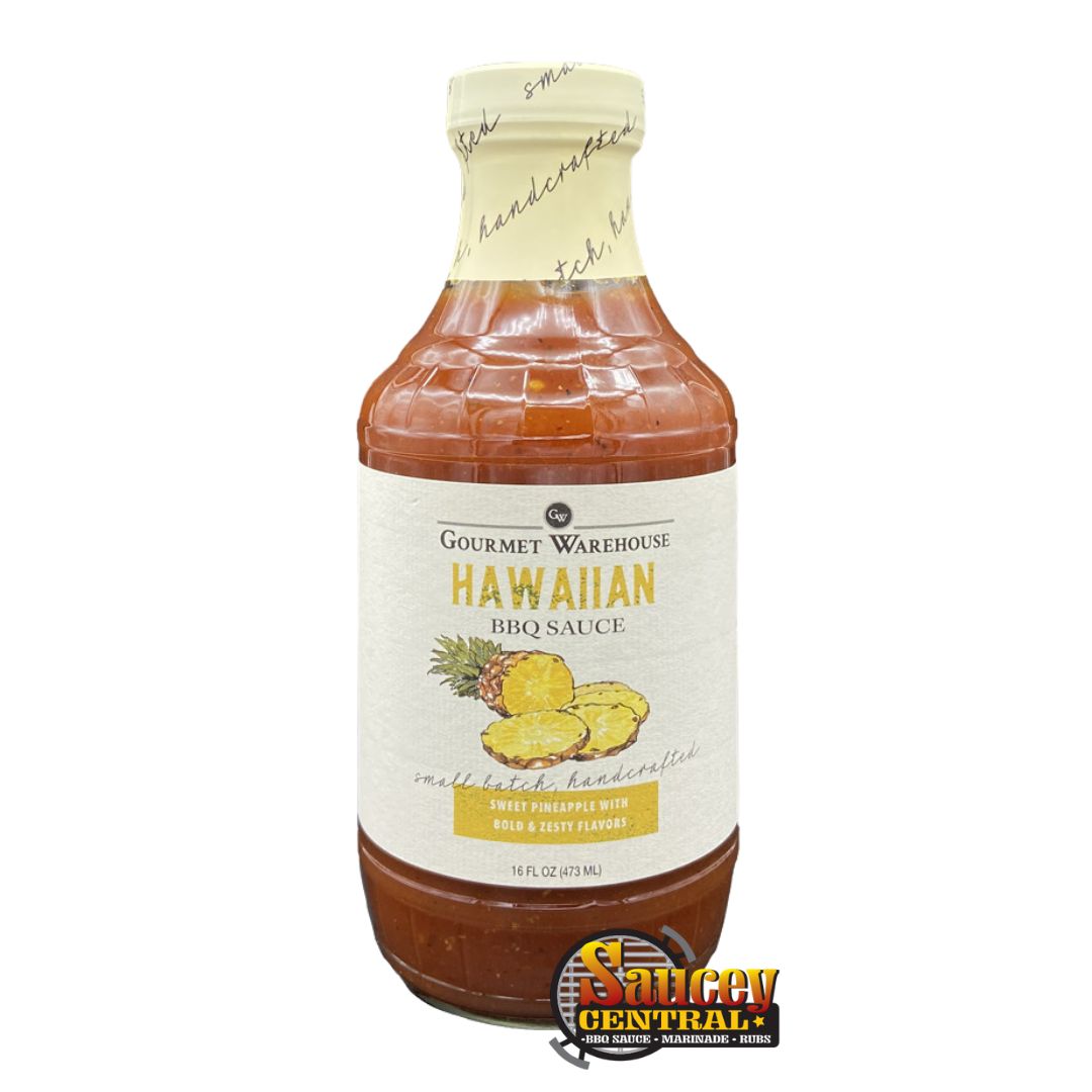 Gourmet Warehouse Craft Hawaiian BBQ sauce with a tropical flair. Our limited edition Hawaiian BBQ sauce contains sweet pineapple with bold & zesty flavors. Our high-quality sauce is crafted by hand in small batches. This sauce does not contain high fructose corn syrup. 16oz.